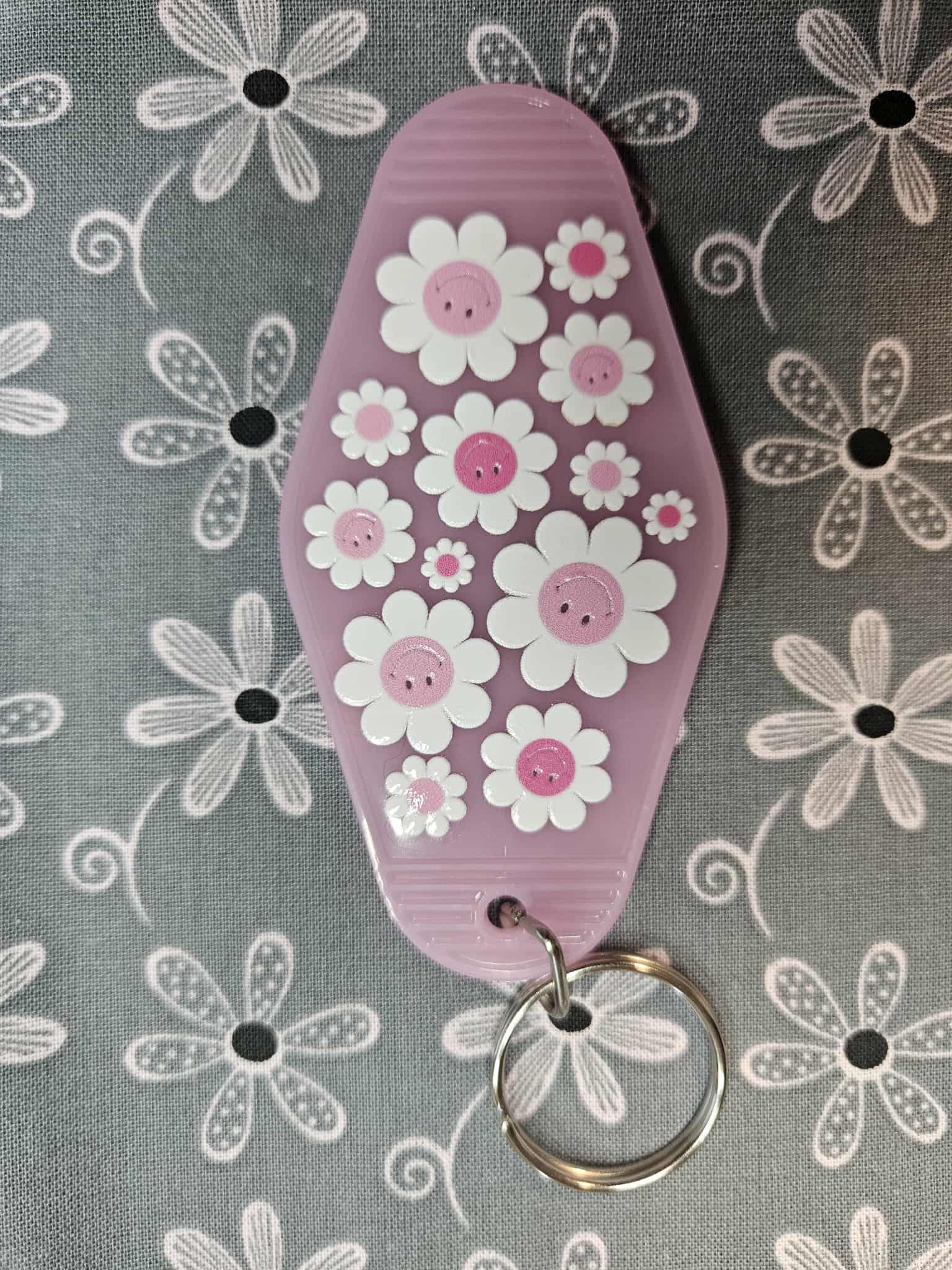 Retro Motel Keychain - Daisy Flower Smiley Faces Pink Acrylic