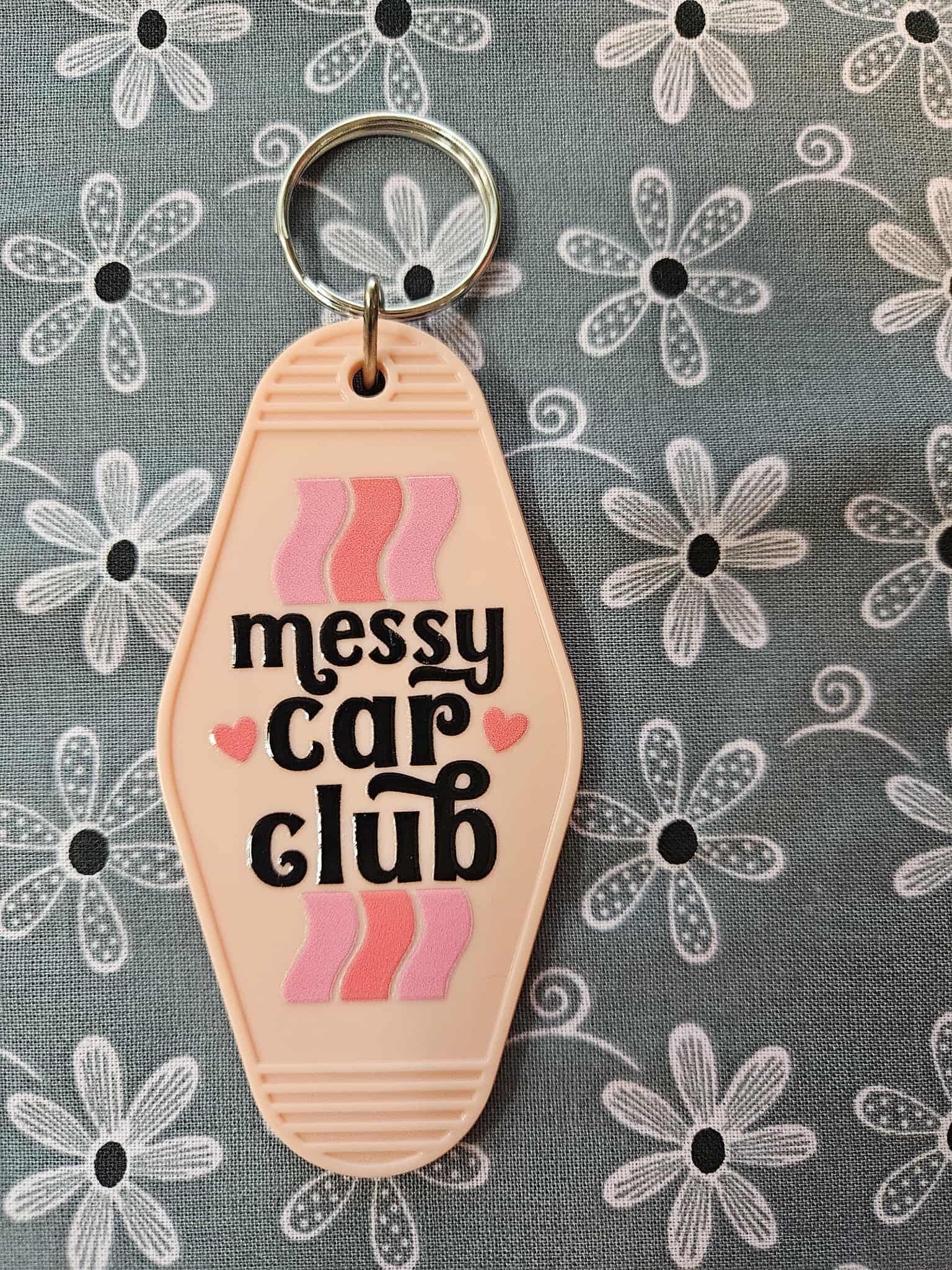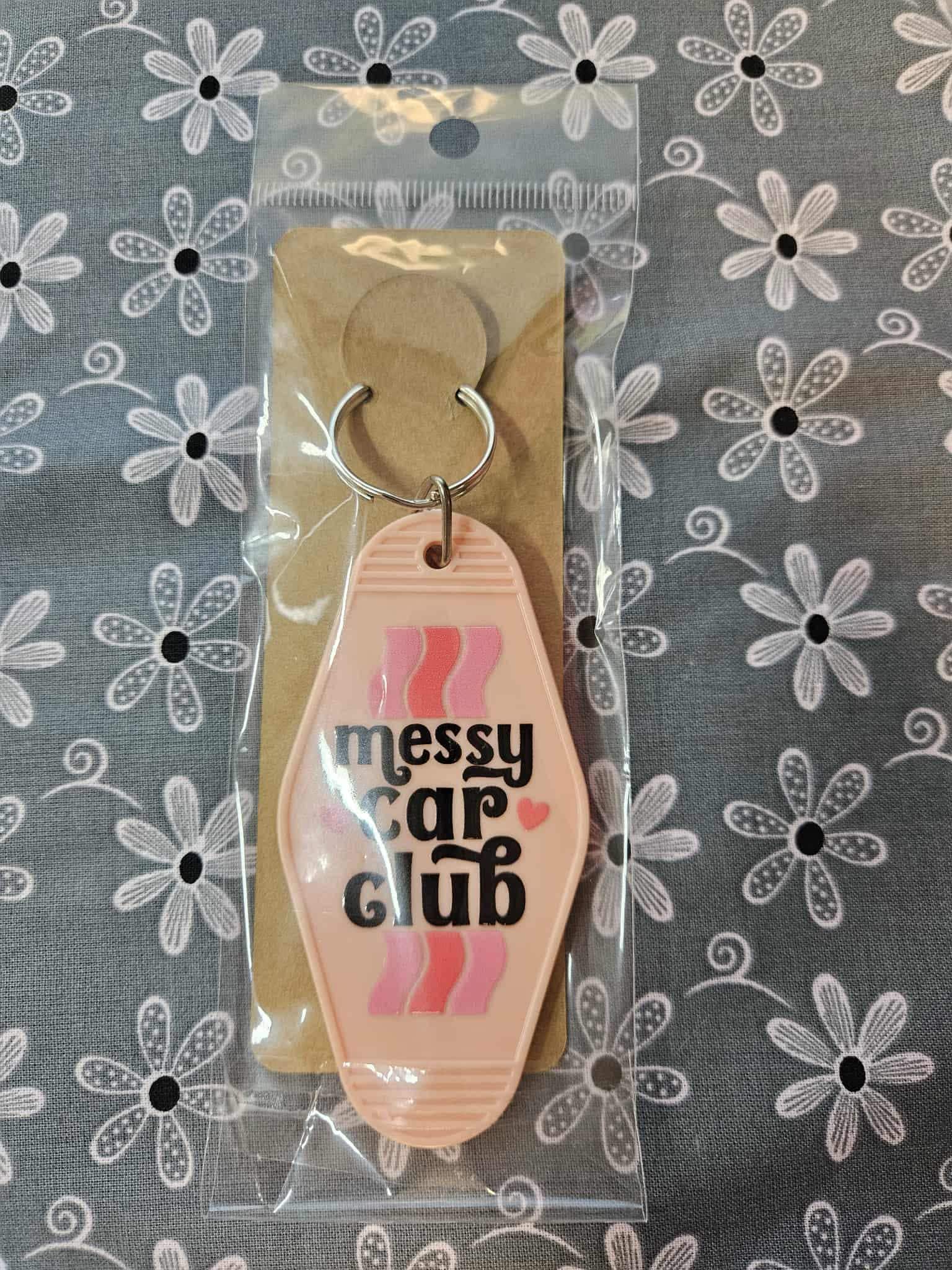 Text: Messy Car Club Size: 3.5" x 1.75" Not Including Jump Ring